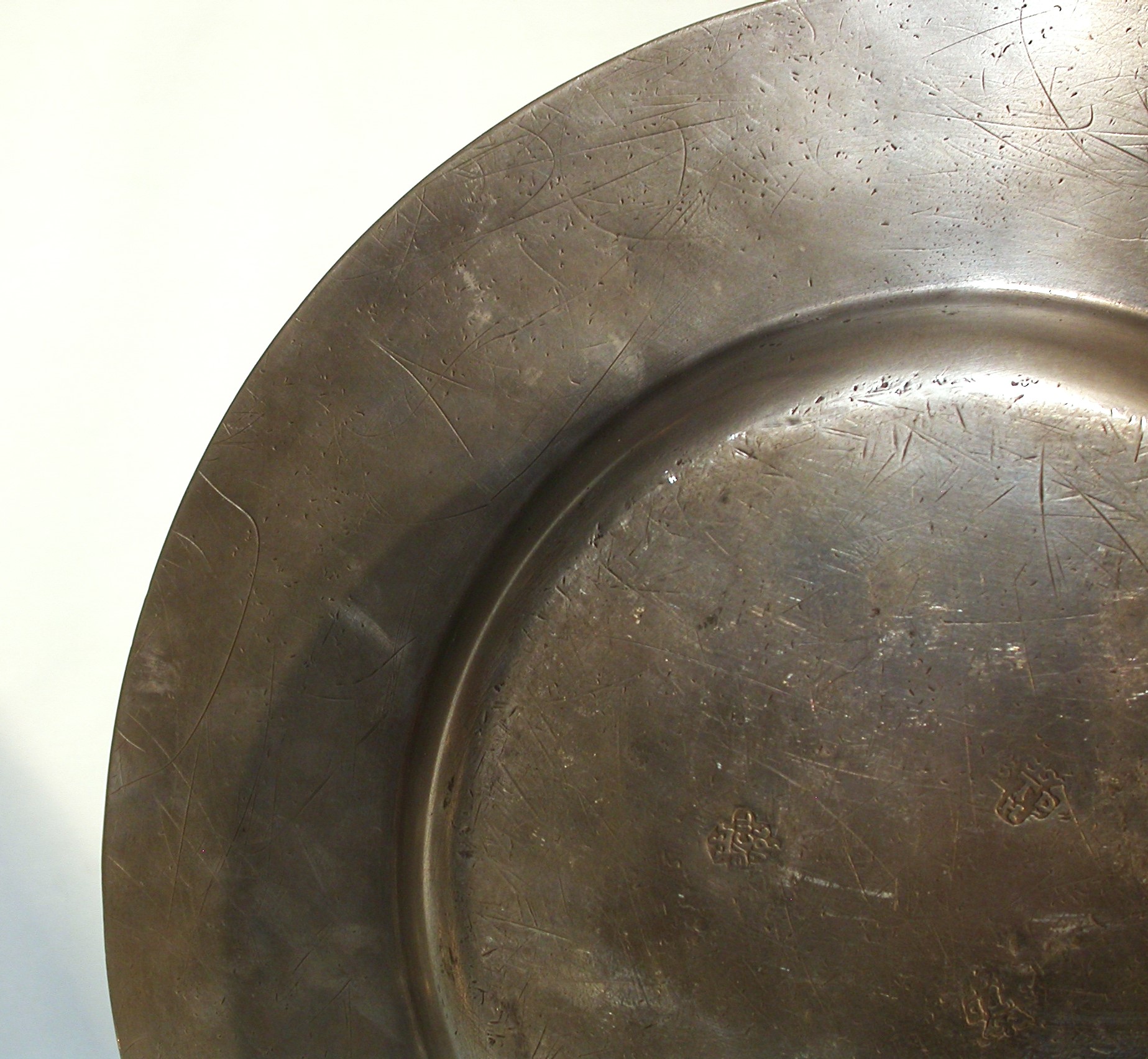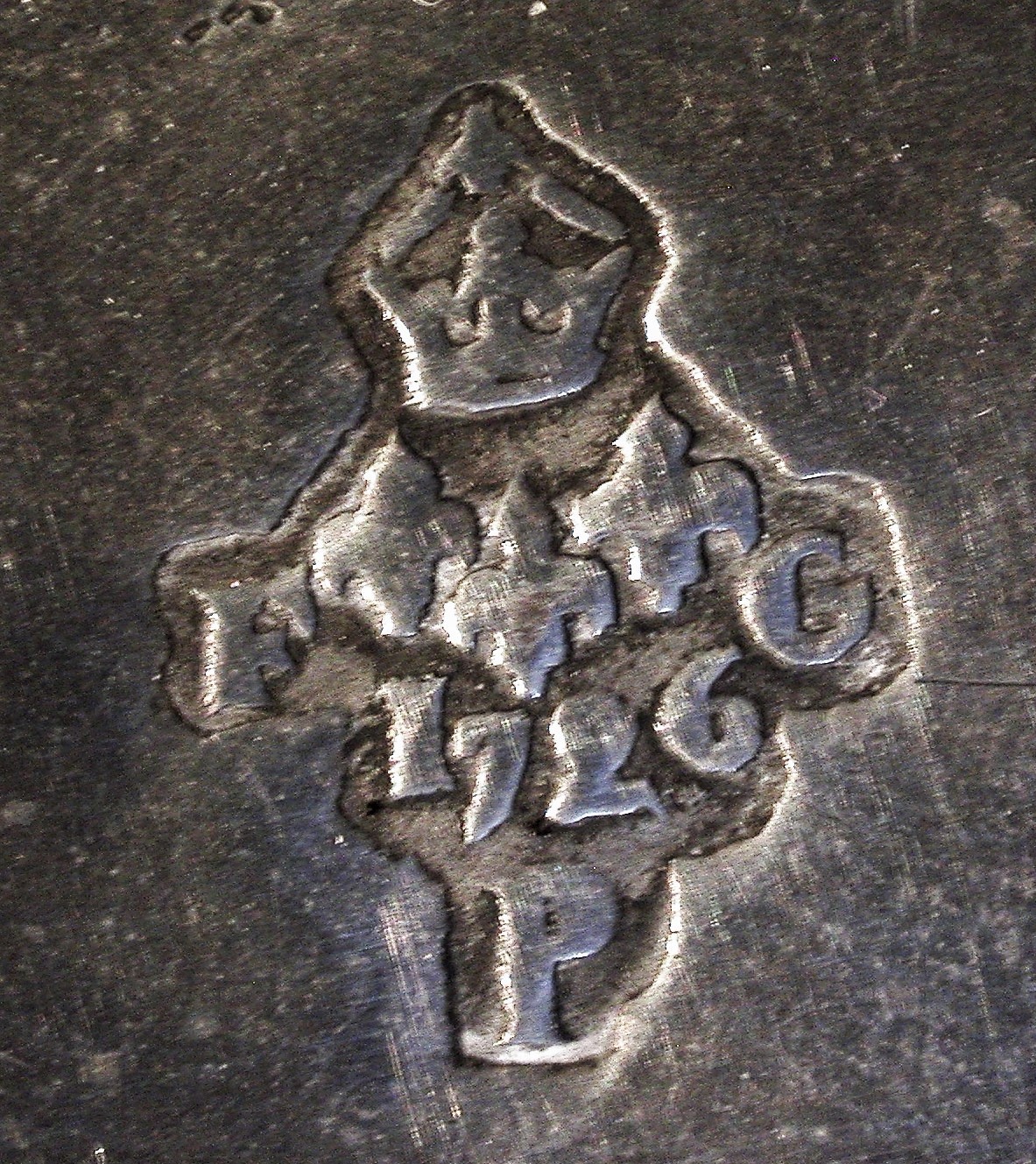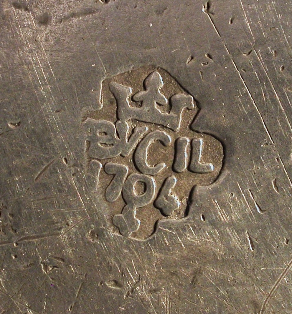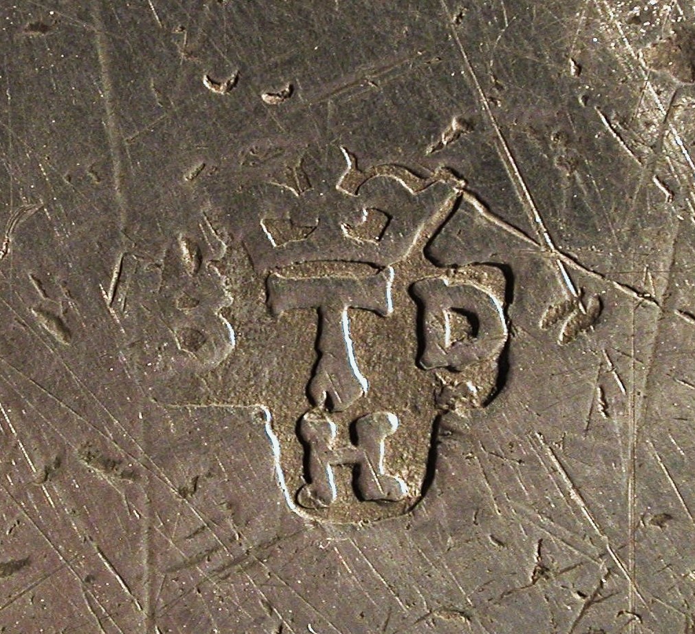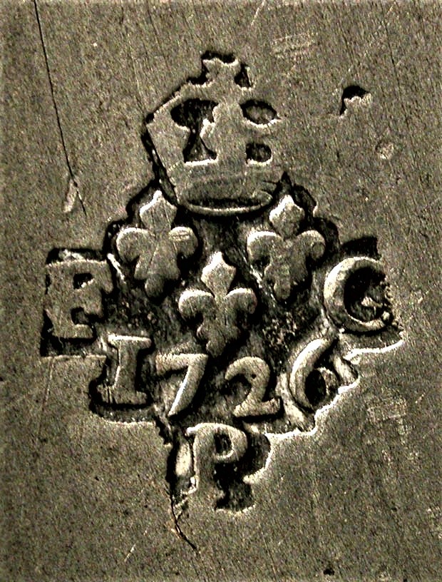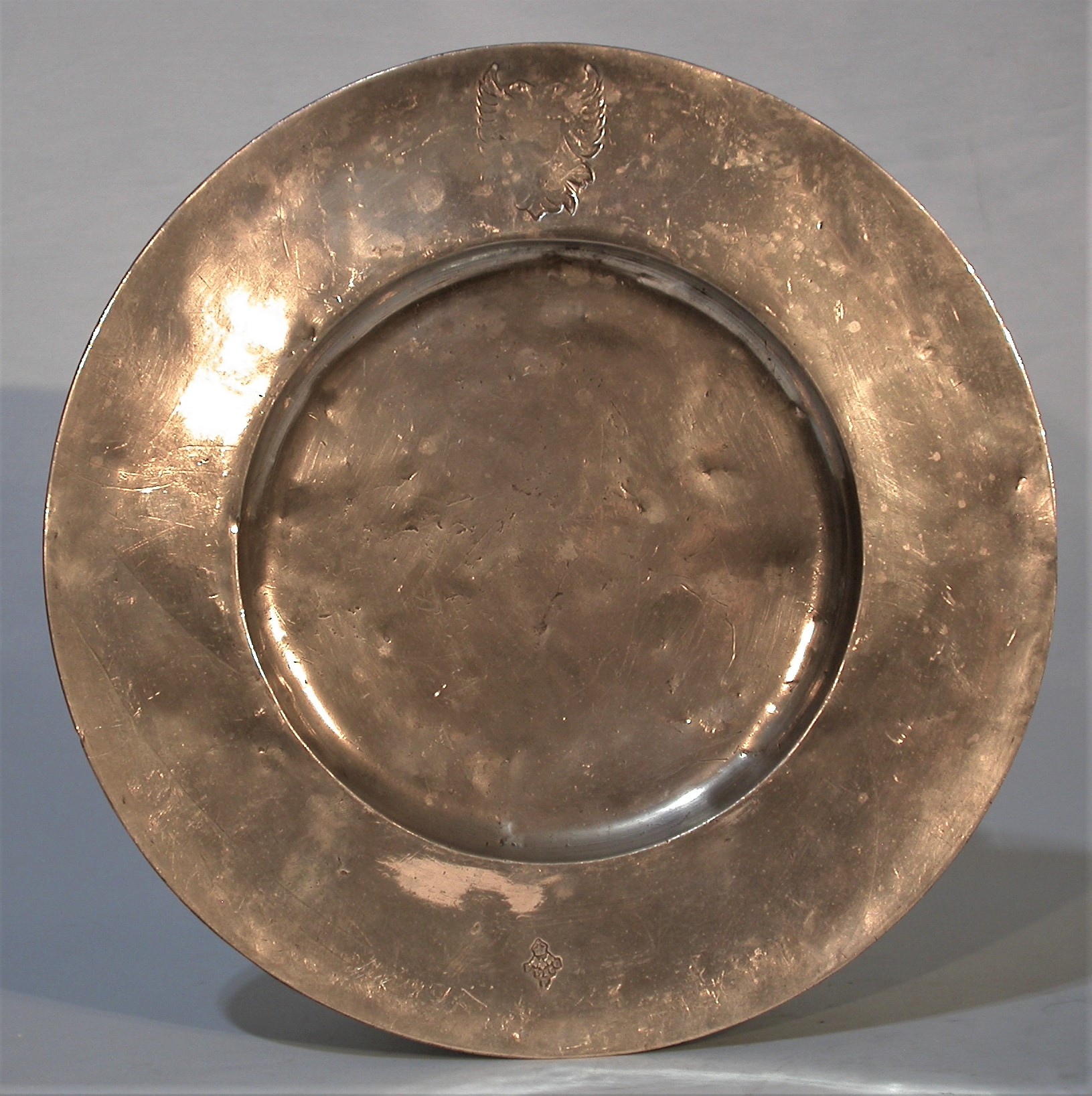 Ce plat est porteur d'un improbable motif de type armorial estampé peu habituel dans la production parisienne et des copies du poinçon de Louis PELTIER reçu maître à Paris en 1720 ainsi que du contrôle de Paris millésimé 1726, (colonne du centre)
