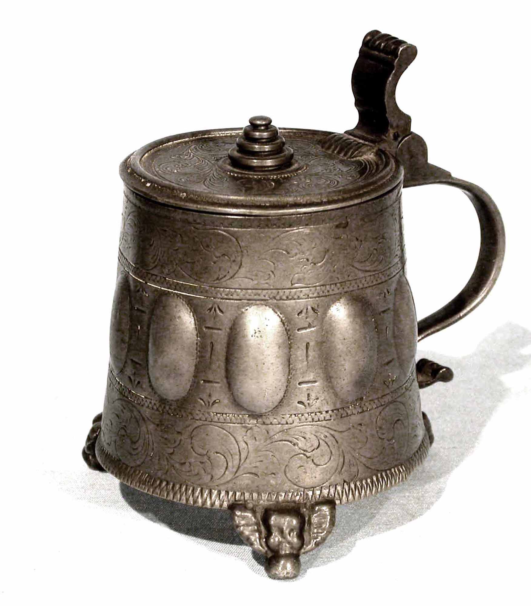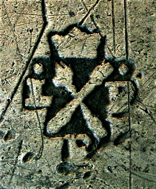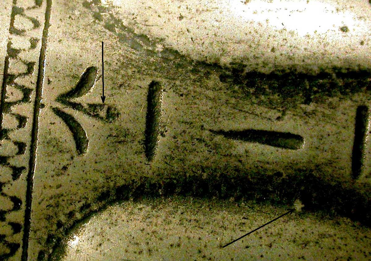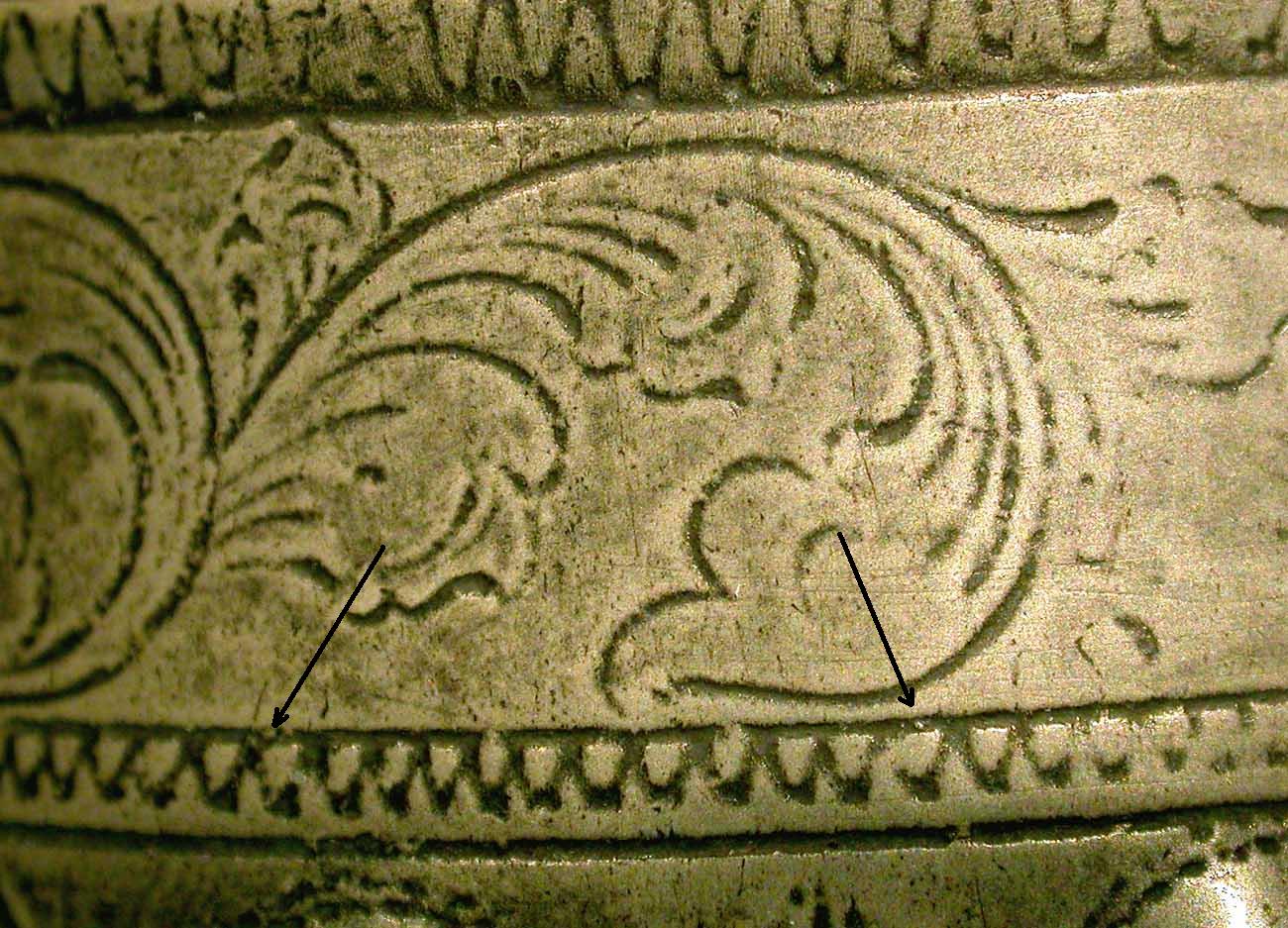 L'examen en grossissement du fond des traits de gravure montre de petites granulations incompatibles avec cette technique. En effet, le passage du ciseau du graveur ne peut laisser subsister de tels témoins qui sont en fait la preuve d'un surmoulage effectué sur une chope authentique du XVII ème s.