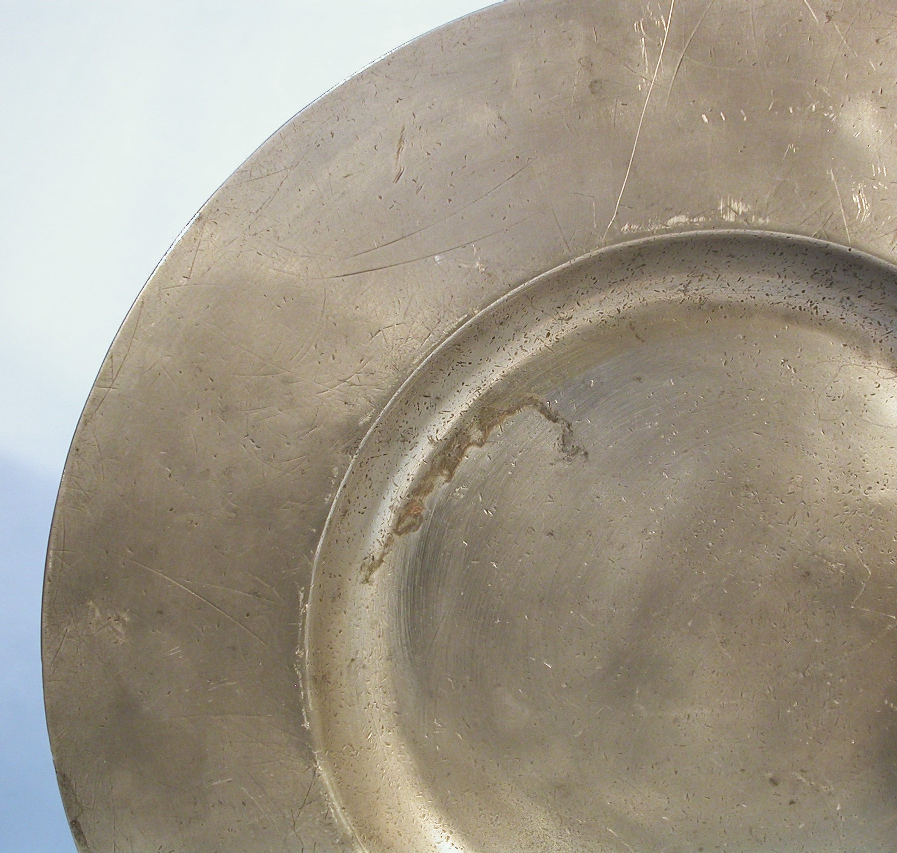 Enfin, ce plat présente des impacts suspects au centre sans qu'aucunes traces de de couteau n'y soient cependant visibles, ainsi qu'un revers noirâtre obtenu chimiquement pour simuler artificiellement un vieillissement.