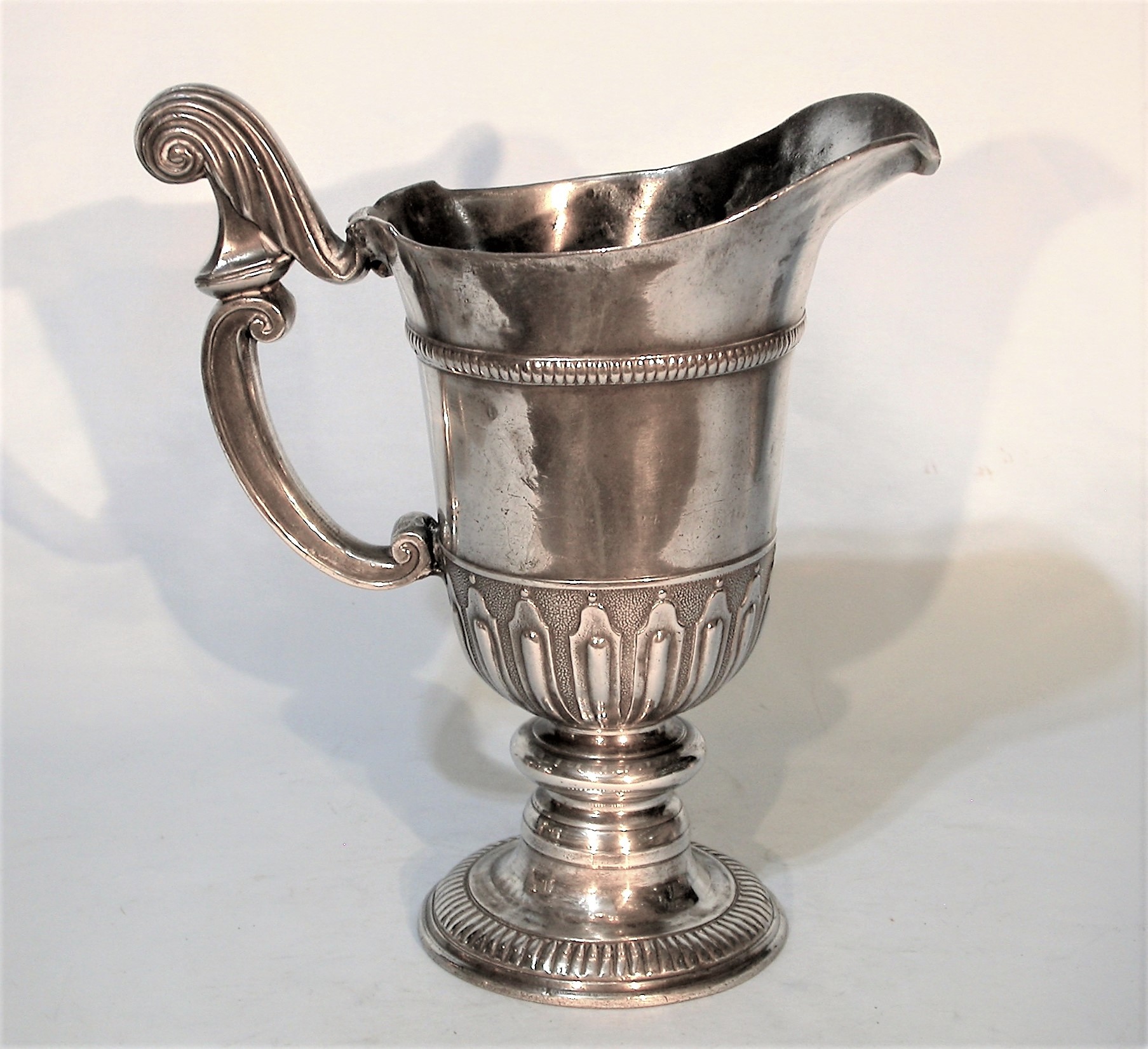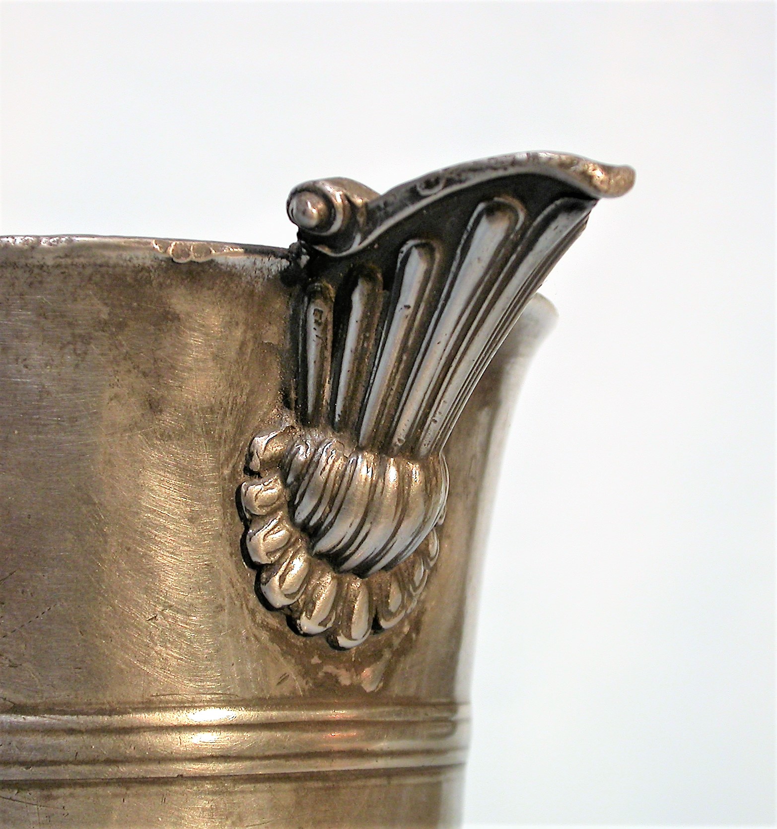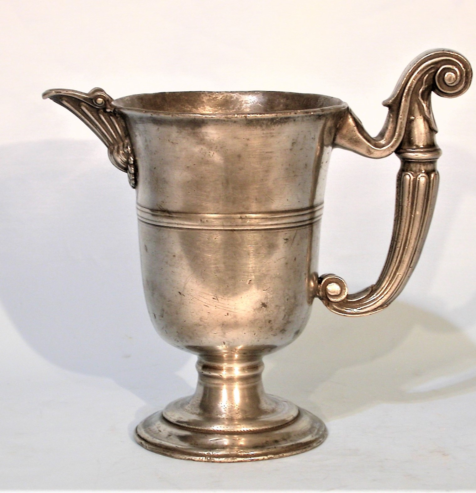 AIGUIERE en étain à gorge en S dite « en casque », à piédouche mouvementé et mouluré, munie d’une anse en C à crosse drapée. Le culot est orné d’une frise de languettes et la partie médiane d’une large baguette moulurée.Poinçon de contrôle : lis couronné : C.G.D.R / P (pour Contrôle Général Du Royaume) de la régie de Martin Girard.