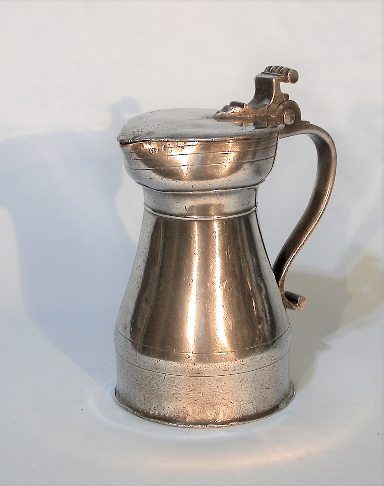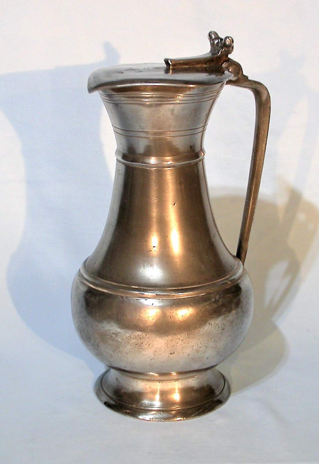 Rarissime PICHET « prototype » en étain de forme légèrement tronconique à base et gorge à peine évasées soulignées d’un filet tourné ; son couvercle légèrement bombé est muni d’une moulure de centrage et d’un poucier « diabolo ». Fondu en deux coquilles longitudinales, il présente au fond intérieur une pastille soudée portant une contremarque très lisible : P / étoile D / deux fleurons sommés d’un soleil, attribuable à Philippot DEMUYLLE maître avant 1506 à POLIGNY ou à Pierre DEGOIX maître vers 1520 à TROYES.