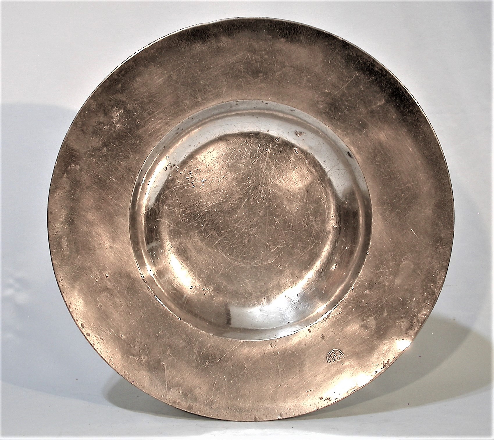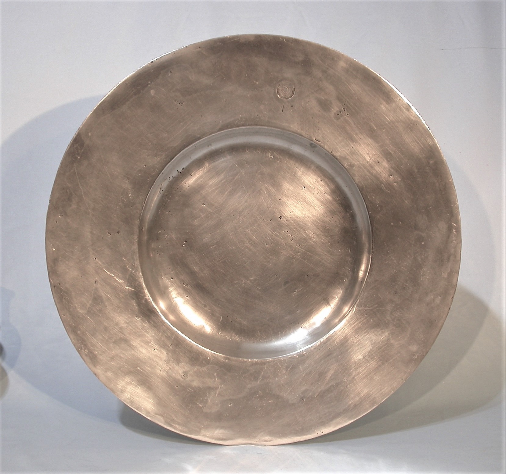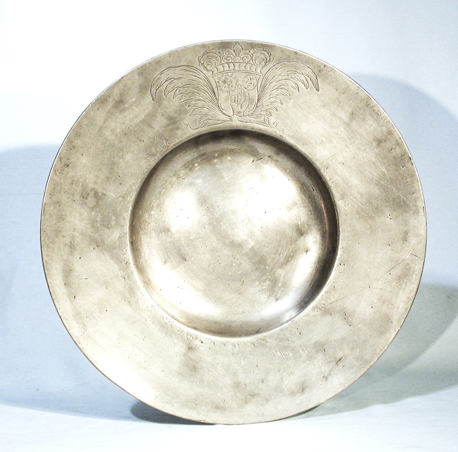 Grand PLAT rond en étain à aile large et bord fortement mouluré dit « à venaison », orné d’armoiries féminines gravées d’argent au chevron de pourpre accompagné de trois merlettes d’azur …Poinçon de contrôle : FF couronnées / 94 / PARIS. Poinçonnage complet de Claude GEVRES reçu maître en 1653 : 1°- marteau couronné / fleurette / C.G / P. 2°- aiguière / GEVRE / ETIN FIN / 1653. Diamètre : 52,8 cm.