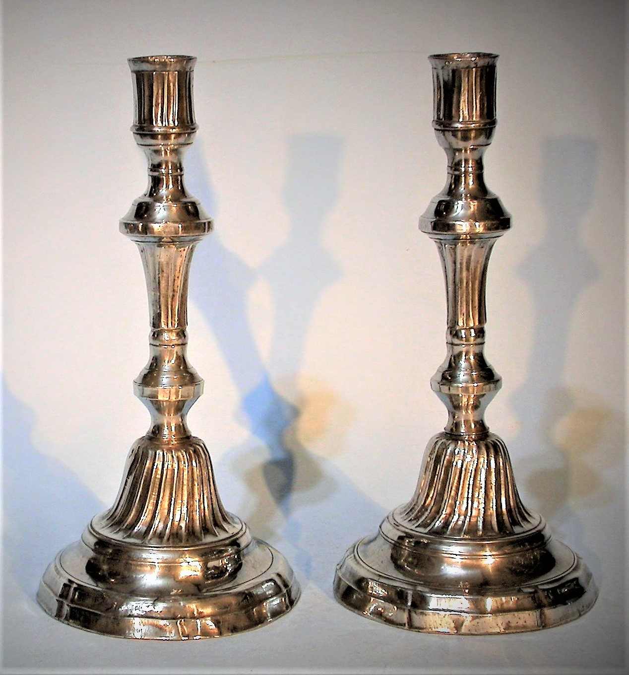 Paire de FLAMBEAUX dits « Bouts de table » en étain, de section hexagonale à piédouche mouvementé et base chantournée, munie de leurs « deux feux » à bras en S, binets cylindriques et bobèches à bord côtelé.