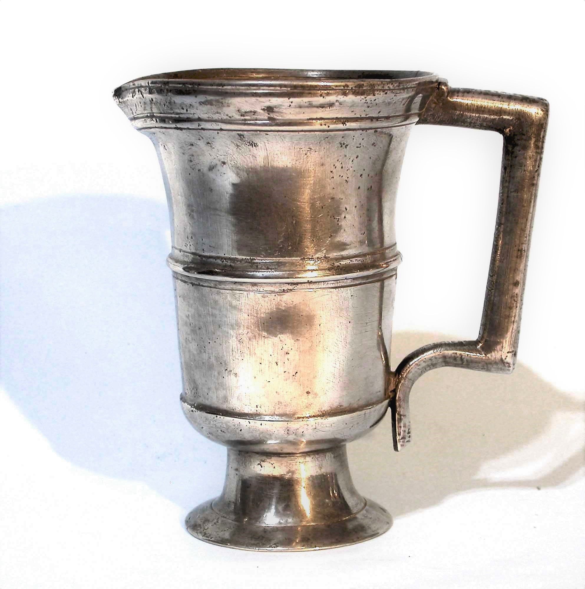 Petit PICHET ouvert en étain, à corps cylindrique et col très légèrement évasé, muni d’une anse à appui-pouce. Poinçon de contrôle : C couronne / 1741 / CHALONS. Hauteur : 12,8 cm.