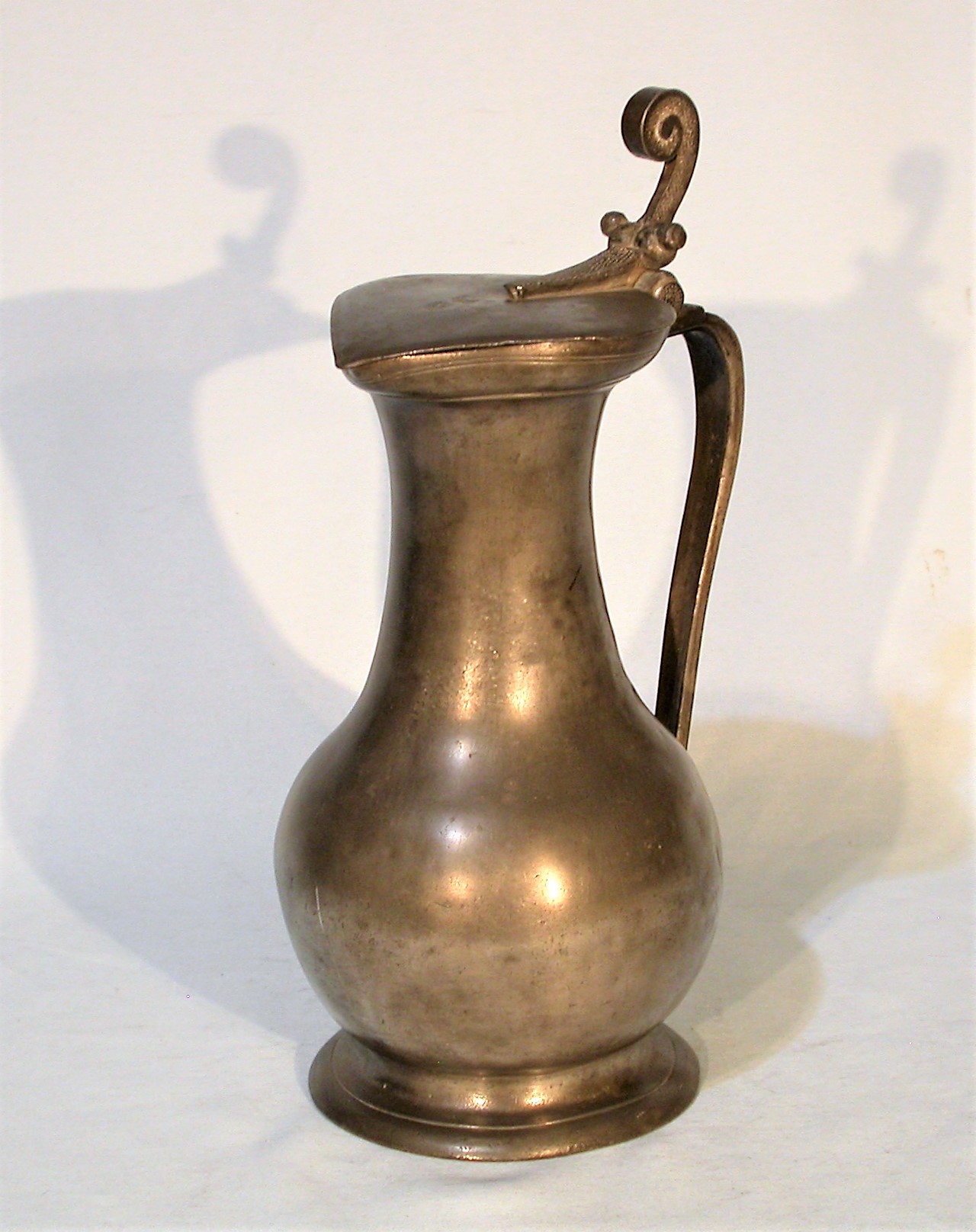 AIGUIERE en étain de forme évasée à gorge horizontale, couvercle mamelonné sommé d’un dauphin lové, poucier voluté et piédouche carré à degrés et angles abattus. Elle est munie d’un bec verseur à coquille et anse en C à longs godrons et crosse drapée.