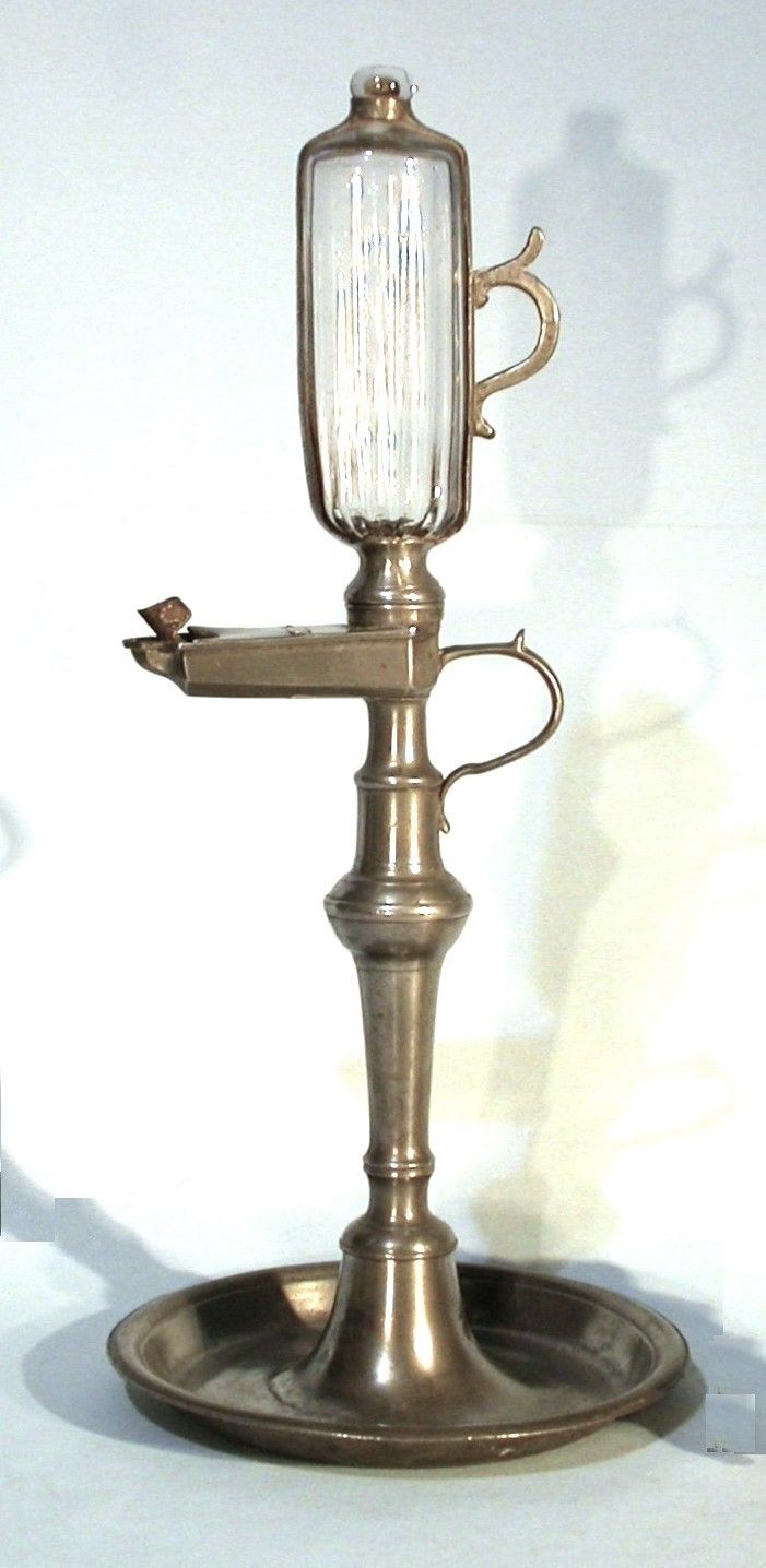 Rare Grande HORLOGE À HUILE en étain à pied en cuvette, fût tronconique bagué, et brûleur à clapet articulé, sommé d’une ampoule en verre cylindrique en verre soufflé côtelé, gainée d’un ruban horaire gradué en chiffre romains. Anse à appui-pouce.