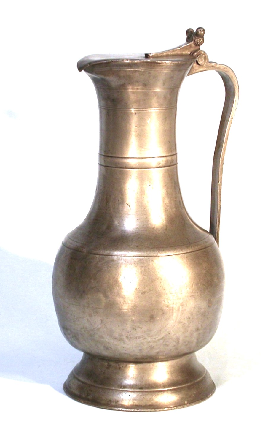 AIGUIÈRE balustre en étain, à piédouche mouluré et orné d’une frise de godrons, gorge courte en quart de rond et anse en C à ressaut et crosse drapée. Elle est gravée d’un vase fleuri. Poinçon de Jean-Baptiste ARMAIN reçu maître à Lausanne avant 1750 : couronne / trois étoiles / I.A.B.